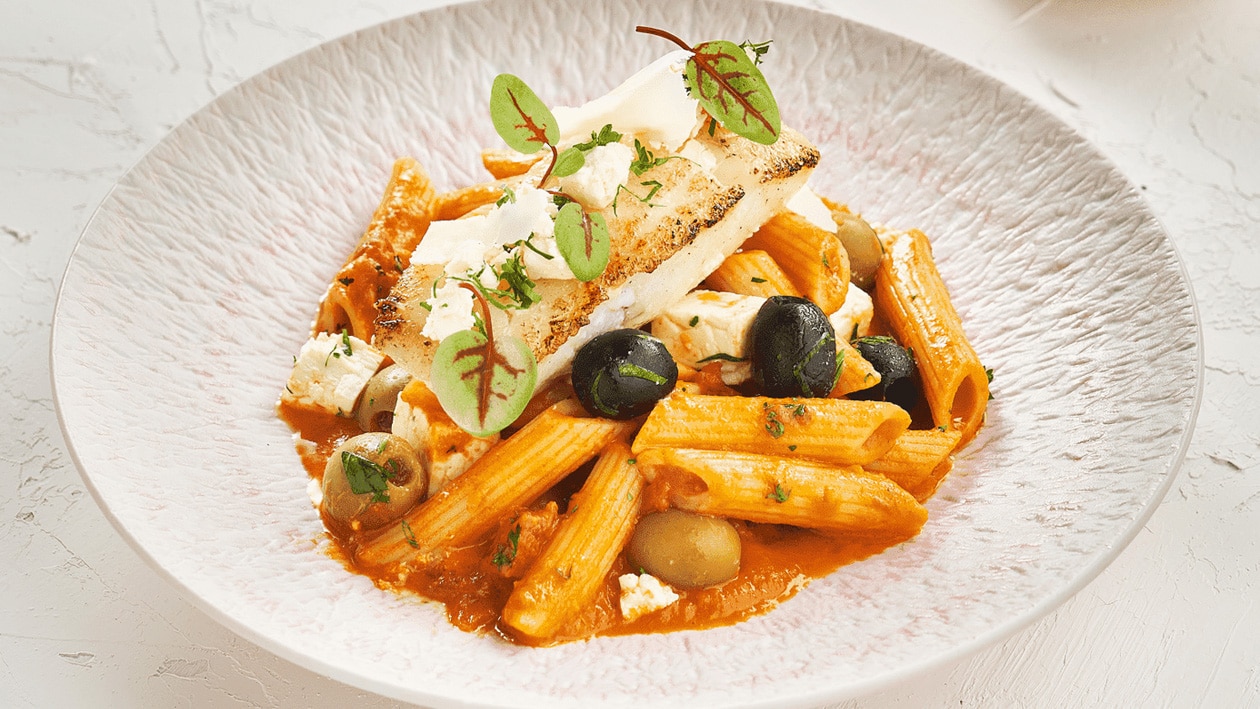 Charred Tomato Rose Pasta with Pan Seared Atlantic Cod Fish